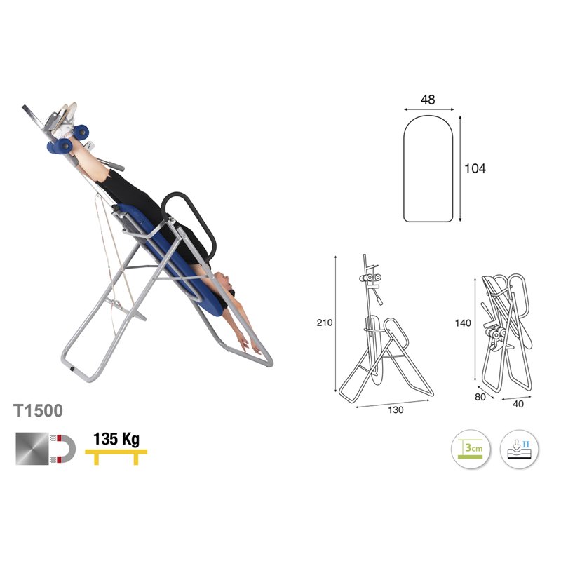 Το κρεβάτι σταθερής αντιστροφής Ecopostural T1500 χρησιμοποιείται για την ανακούφιση του πόνου στην πλάτη και τη διατήρηση της σπονδυλικής στήλης. Είναι ευεργετικό σε ορισμένες περιπτώσεις, όπως κήλη, οσφυαλγία ή οσφυαλγία. Η ανεστραμμένη θέση που λαμβάνουμε χάρη σε αυτόν το κρεβάτι βελτιώνει, με σημαντικό τρόπο, την καλή λειτουργία του οργανισμού προάγοντας την οξυγόνωση του εγκεφάλου, την κυκλοφορία του αίματος παρέχοντας οξυγόνο στα κύτταρα και το λεμφικό αποστραγγίζοντας και καθαρίζοντας τα κύτταρα.