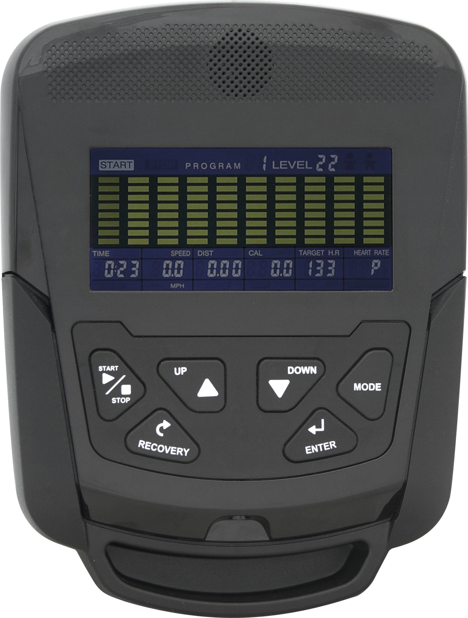 - Ενδείξεις: Χρόνος, Ταχύτητα, Απόσταση, Θερμίδες, Καρδιακοί Παλμοί, Περιστροφές/λεπτό, Ποσοστό λίπους, Επαναφορά